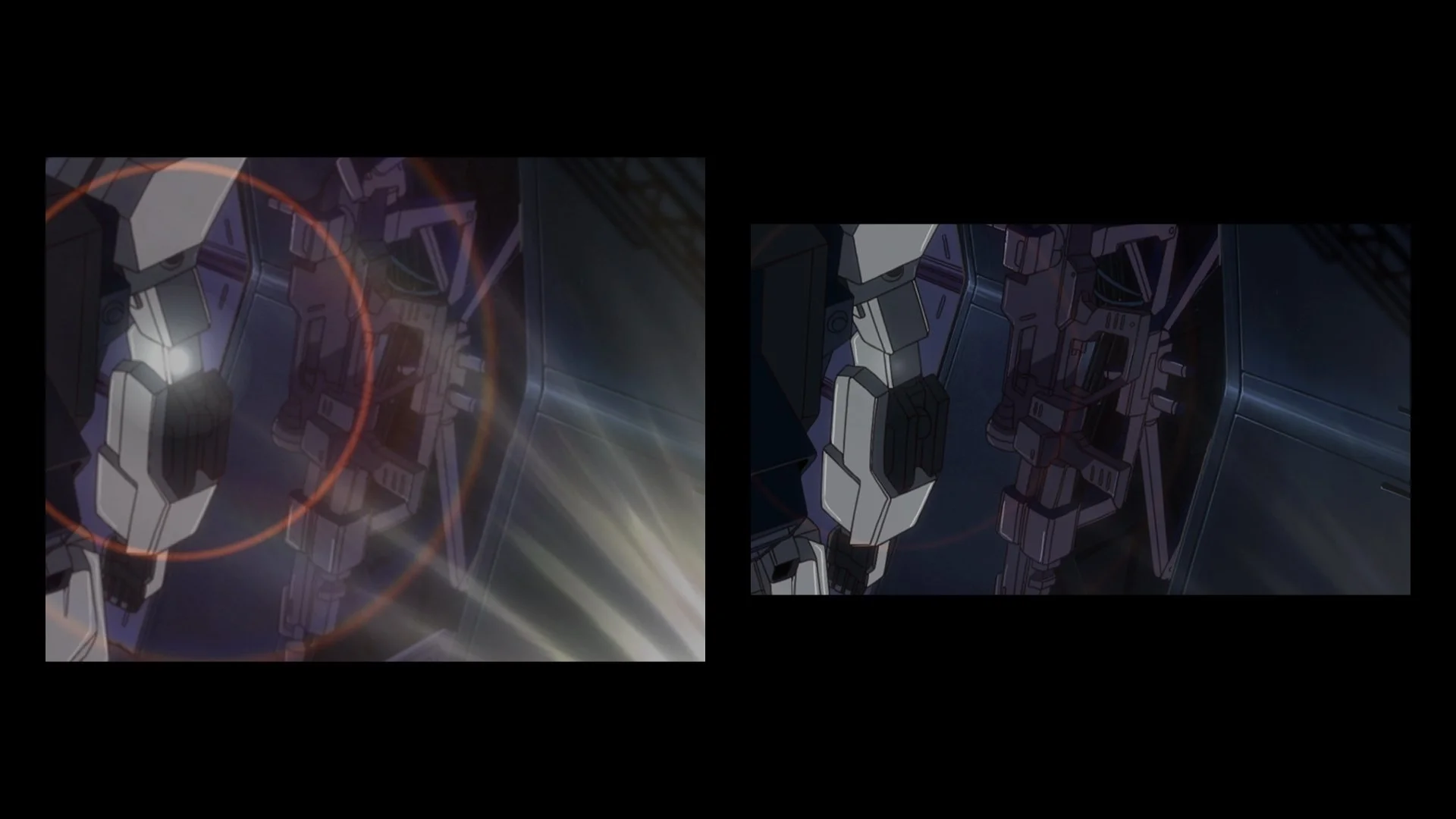 The new Mu animation has ben switched in for this flashback scene. Blur treatment is also slightly different, and saturation has been reduced across the whole frame.
