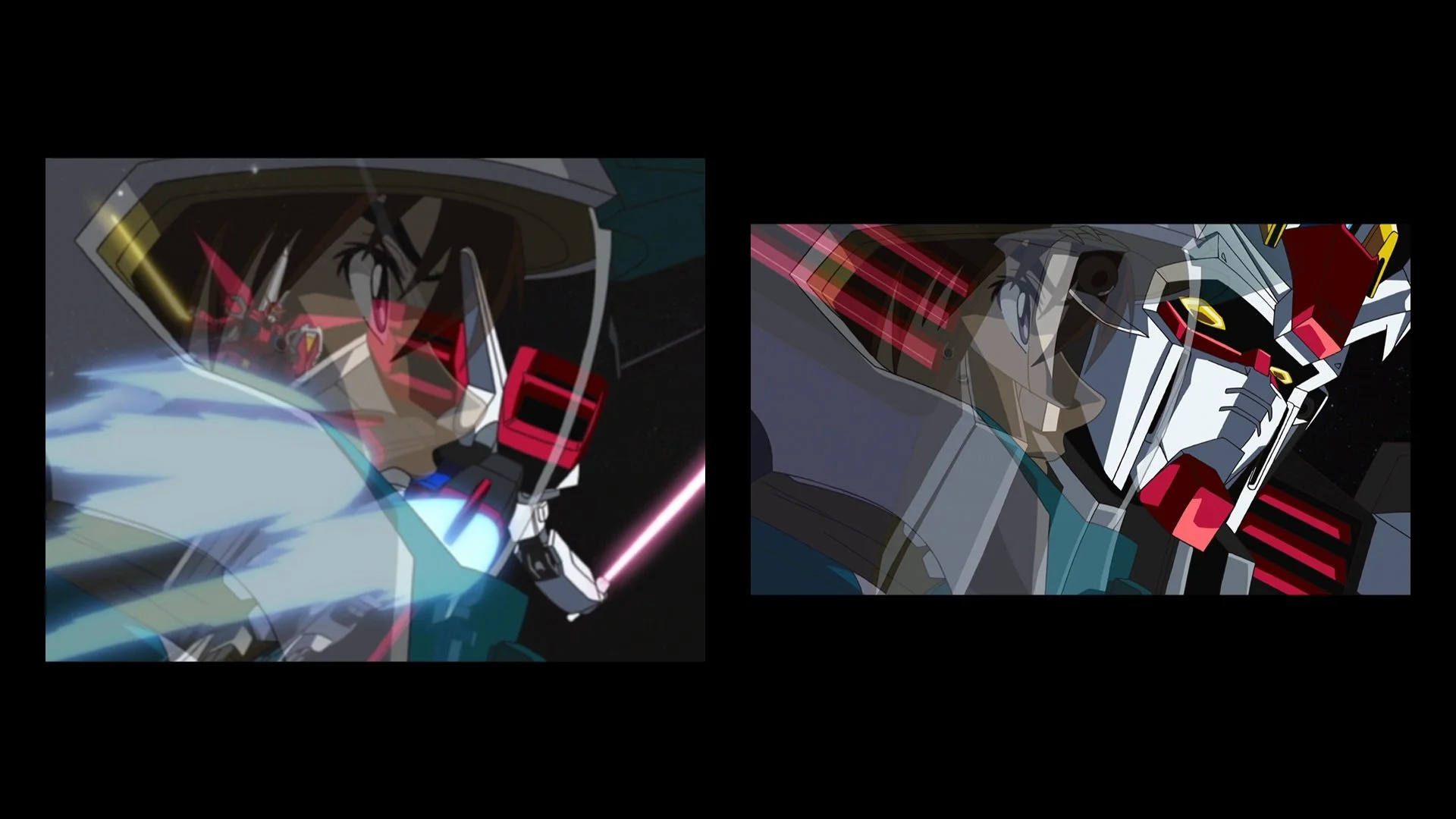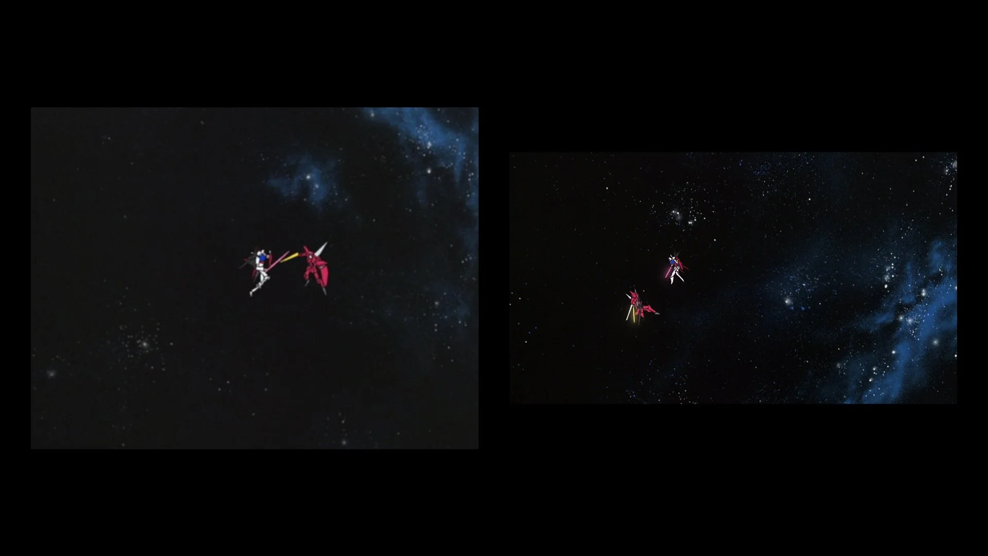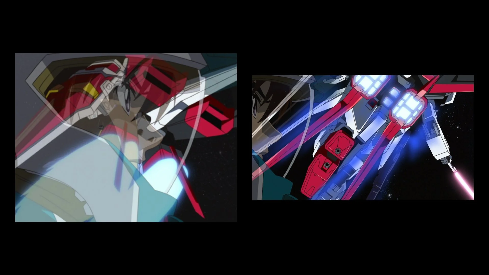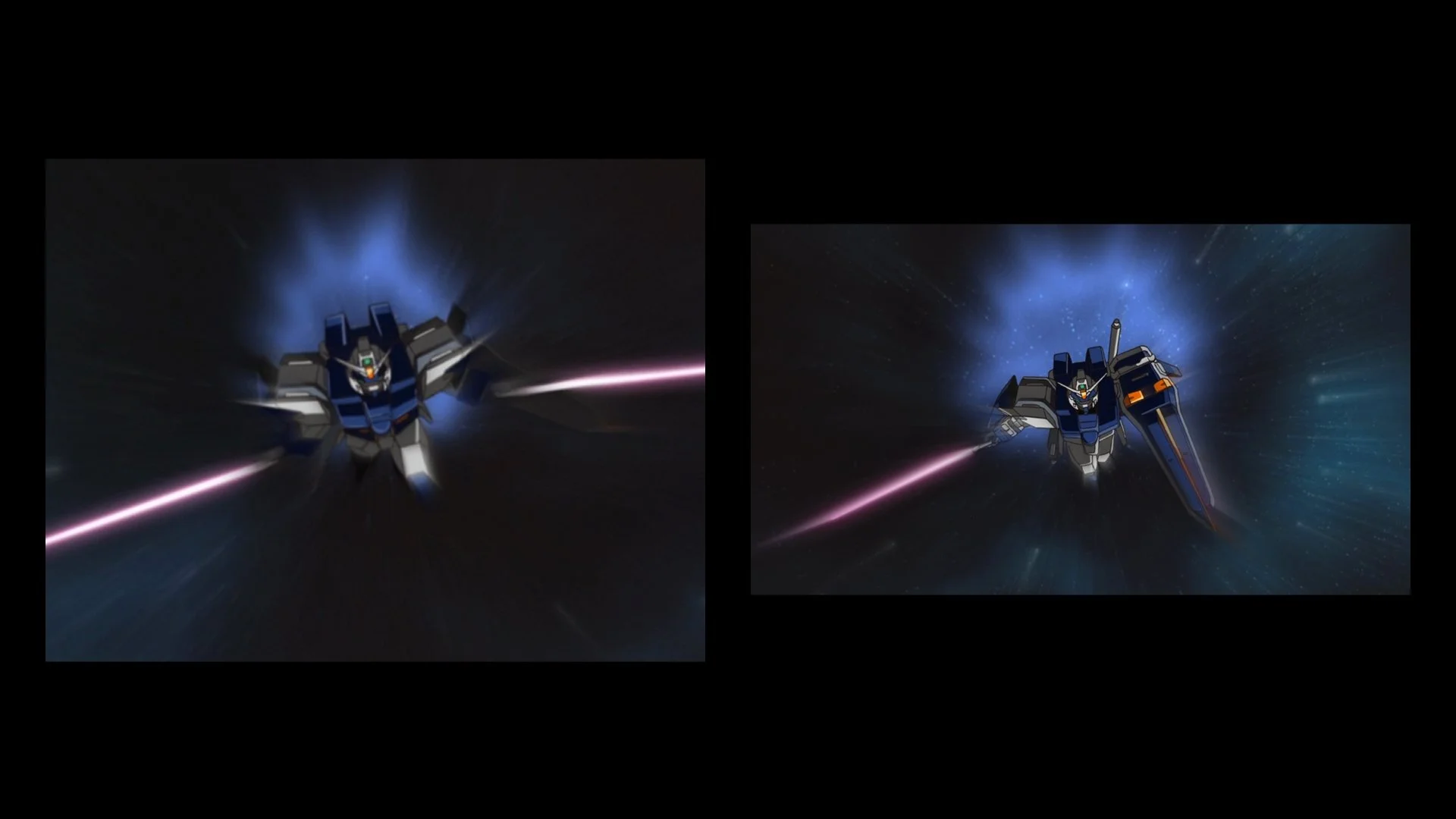 The Aegis Gundam enters the frame from the opposite side, yet settles in the same central position.